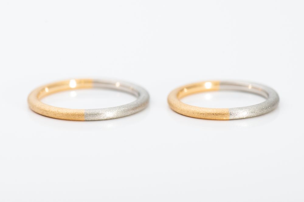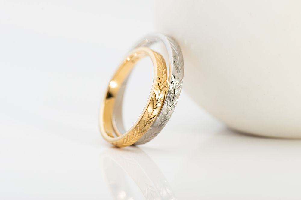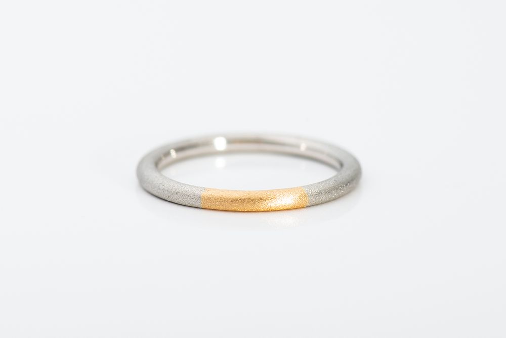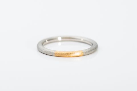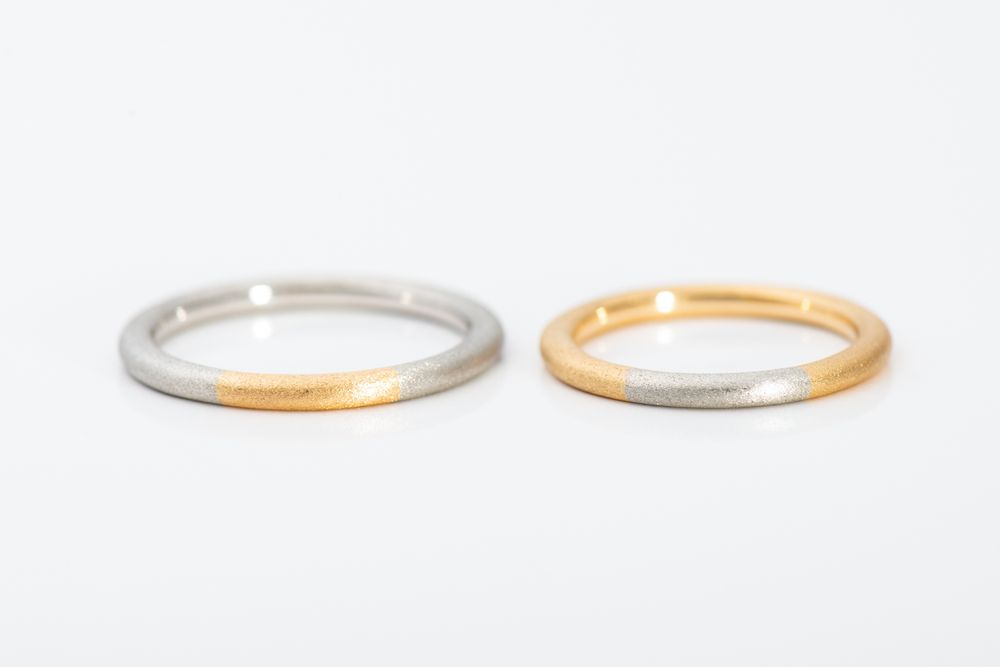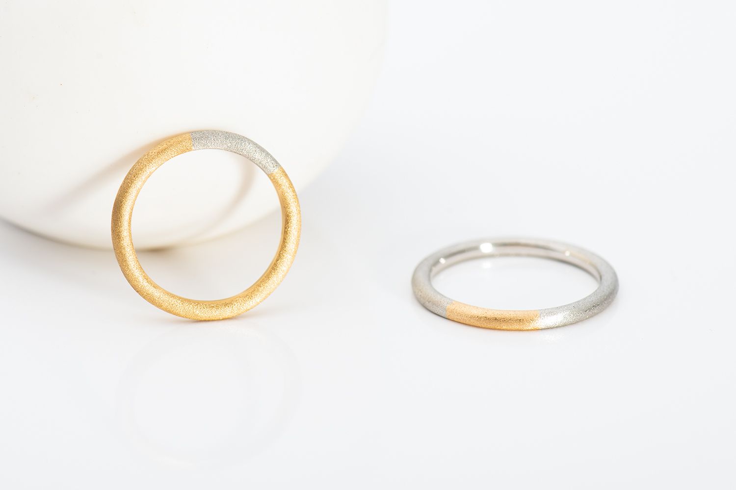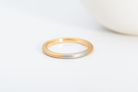 イエローゴールドとプラチナのハーフコンビネーションリング。リング幅約 1.9mm/ 厚み 2.0mm という絶妙なサイズバランスを追求し、独特なシェイプが生まれました。重厚感と同時に、ツートーンが美しく響き合い繊細さも備えた仕上がりです。