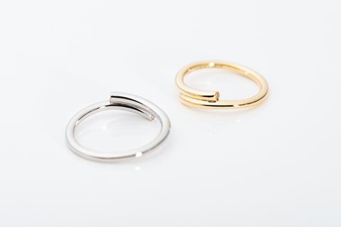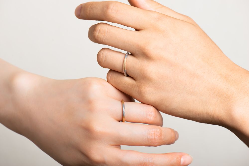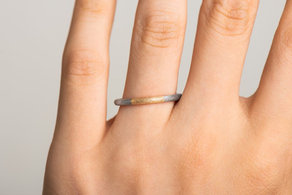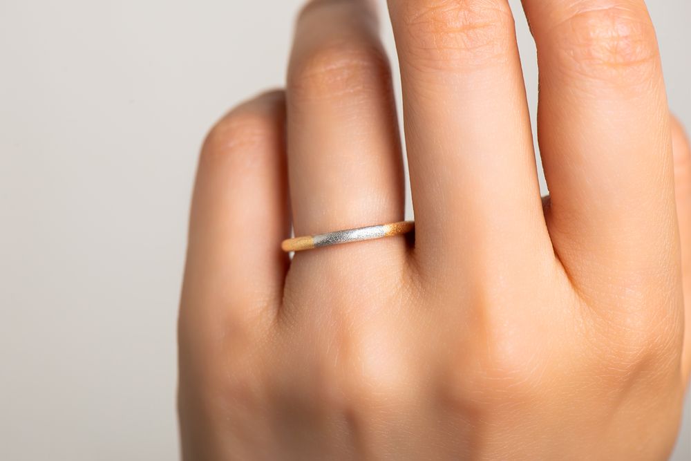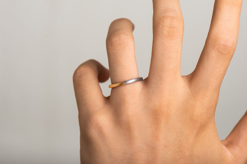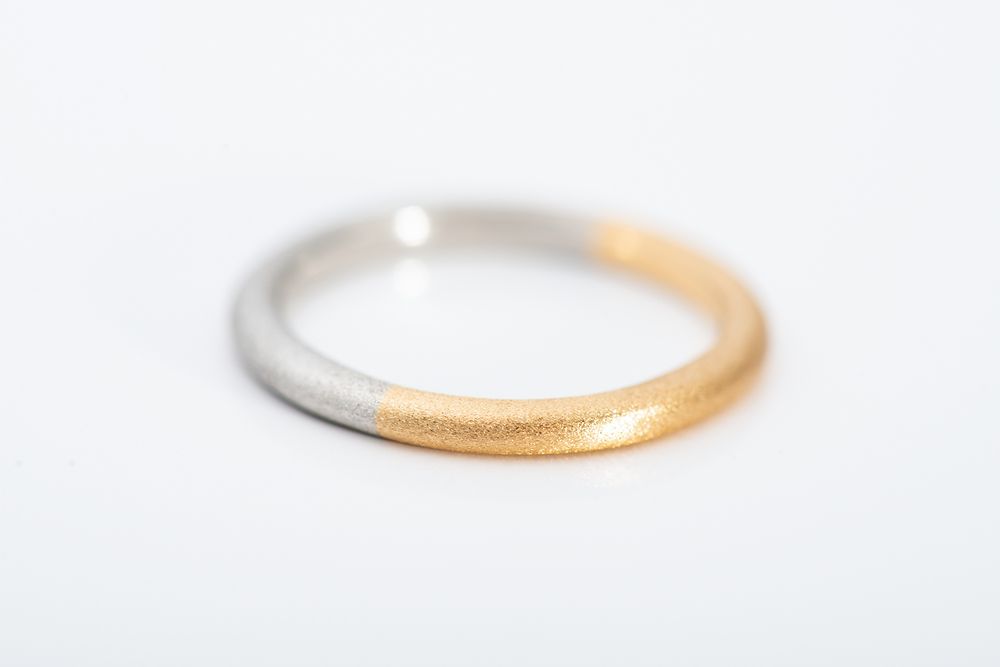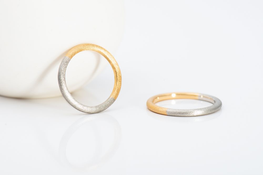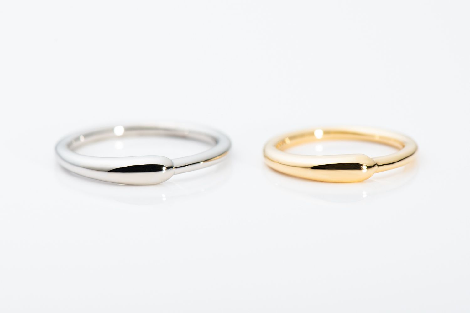 イエローゴールドとプラチナのハーフコンビネーションリング。リング幅約 1.9mm/ 厚み 2.0mm という絶妙なサイズバランスを追求し、独特なシェイプが生まれました。重厚感と同時に、ツートーンが美しく響き合い繊細さも備えた仕上がりです。