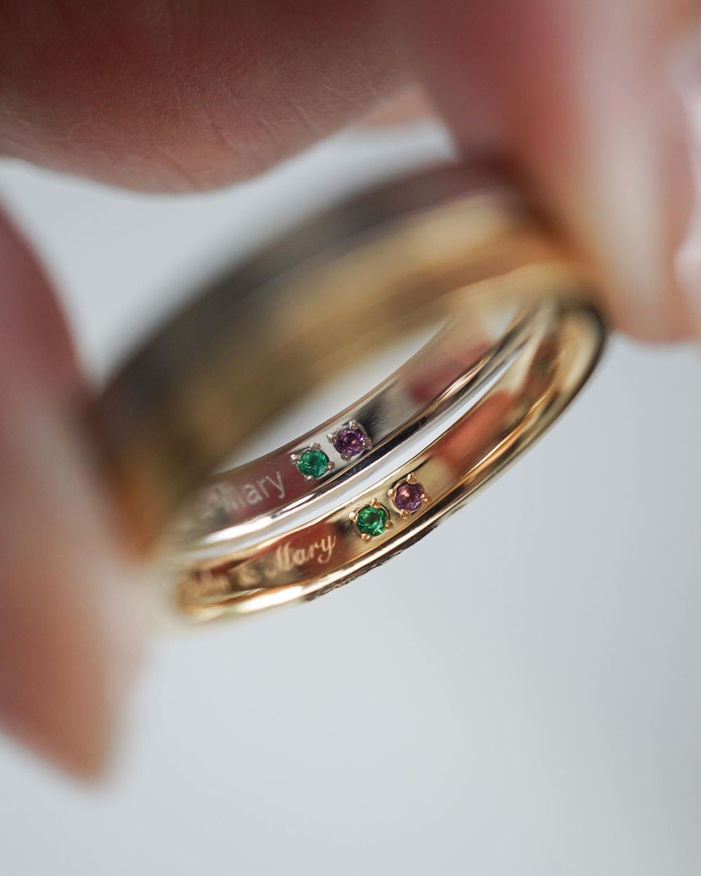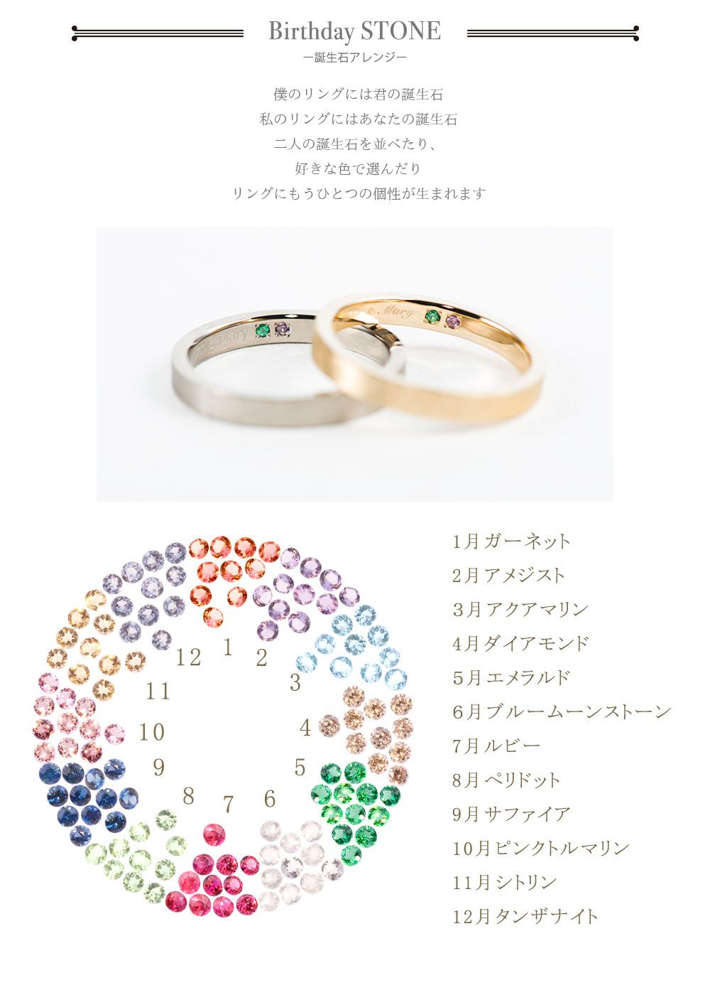 マリッジリングの内側に誕生石をお入れするオプションをフェア期間限定でプレゼント。12ヶ月の誕生石の中からお好きなお石を1石ずつお選びいただけます。
